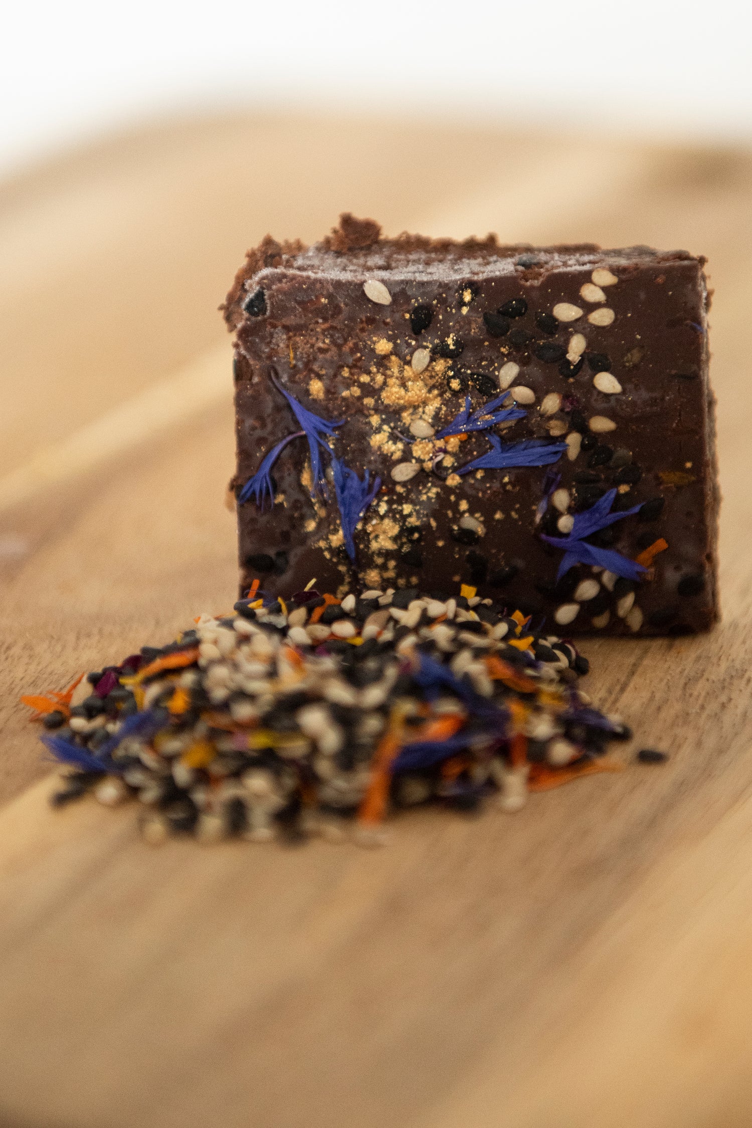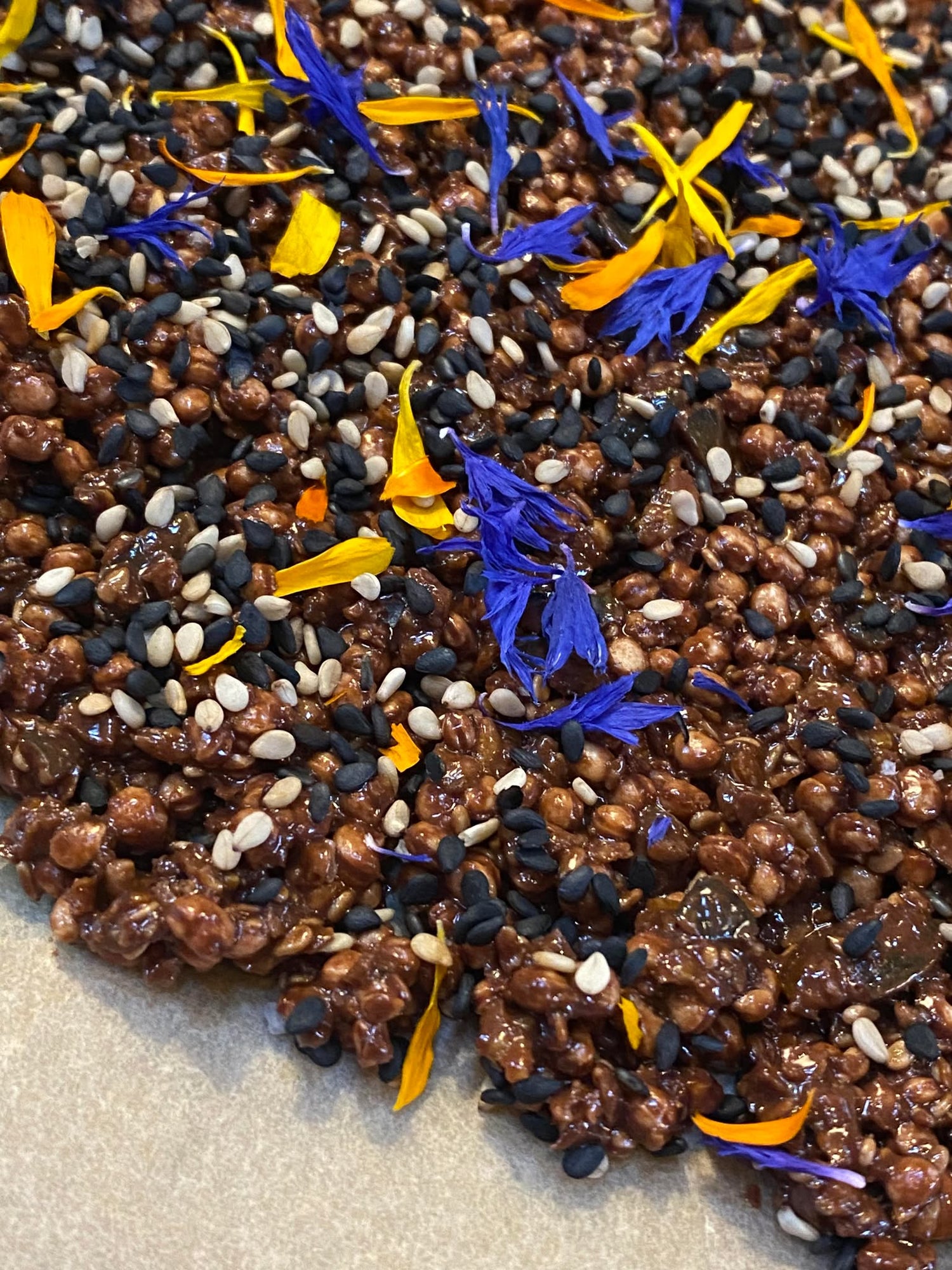 Afkøl og pynt med smeltet chokolade (min. 70%) og pynt med sesam blanding & evt. guldstøv.