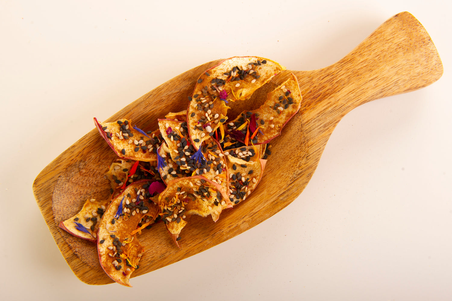 Fjern kernehus og halvér æblet. Skær tynde skiver og læg dem på bagepapir. Drys med ægte 100% ceylon kanel og sesammix. Tørres i tørremaskine 7-9 timer ved 60 grader. Opbevares lufttæt. Kan anbefales som glutenfri "småkage".