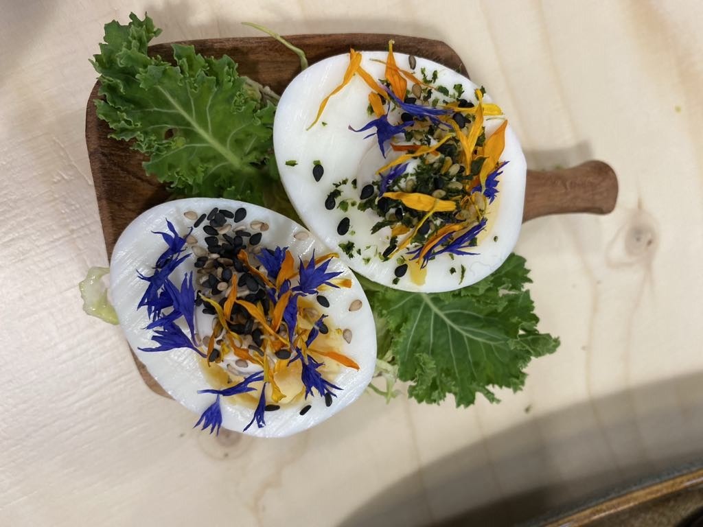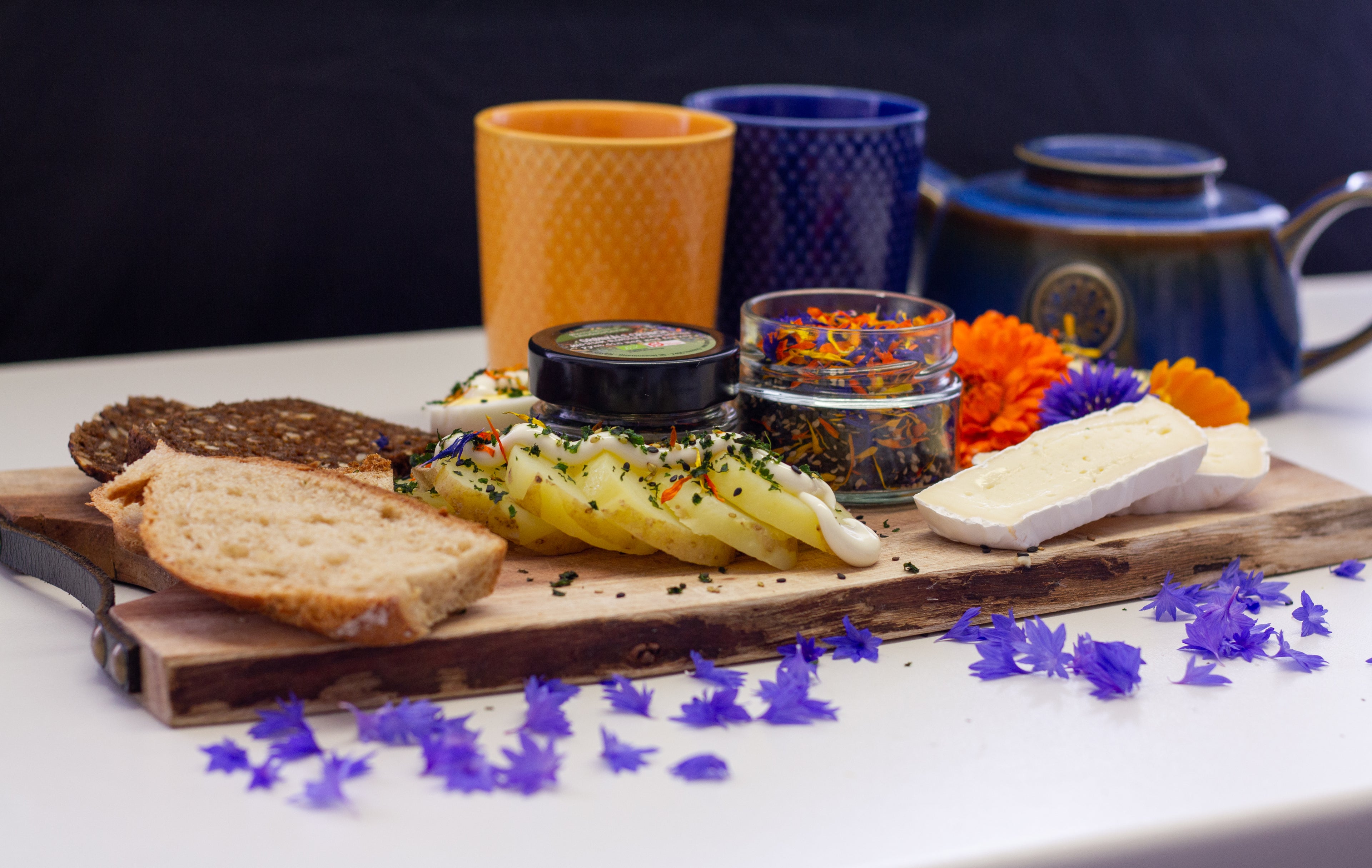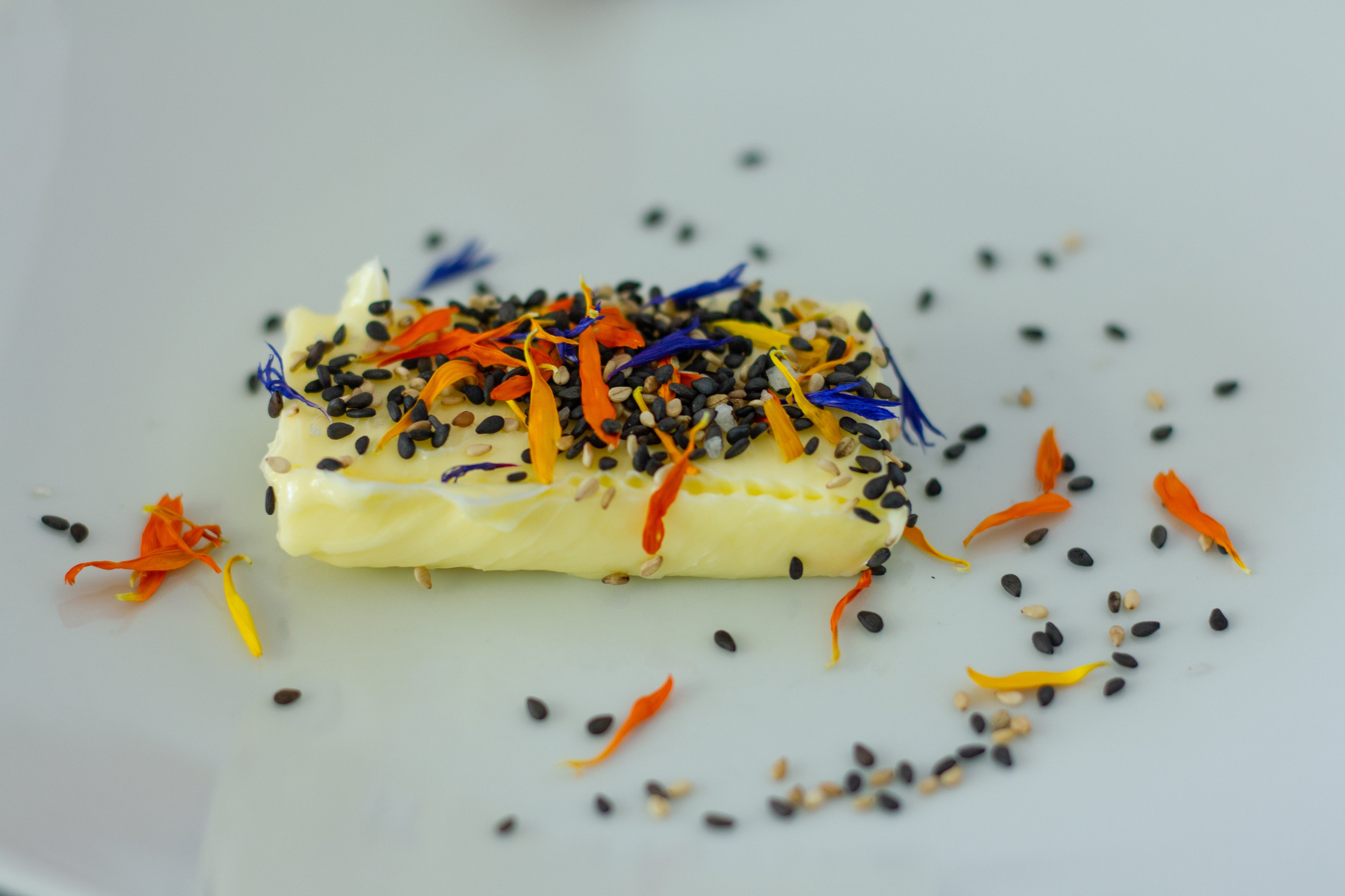 De tørrede blomster og toppings fungerer som et lækkert pift til alverdens rugbrødsmadder. Her ses f.eks. en æggemad, hvor blomster og frø løfter smagsoplevelsen.